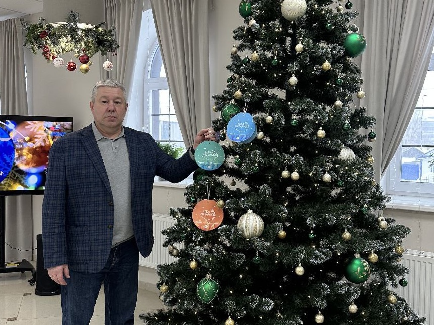 Дмитрий Ошурков снял с праздничной ели шарик с пожеланием двух детей семьи Христенко, папа которых участник СВО, погиб при выполнении боевых задач. Дети попросили книги.