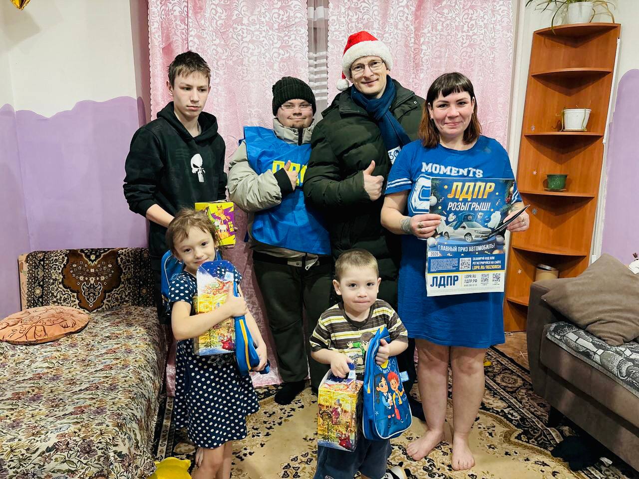 Координатор Ишимского отделения ЛДПР Владимир Баянов, активист молодежного движения ЛДПР Дмитрий Зольников и активист ЛДПР Дарья Пугина поздравили с наступающими праздниками детей участников СВО и из многодетных семей и вручили долгожданные подарки