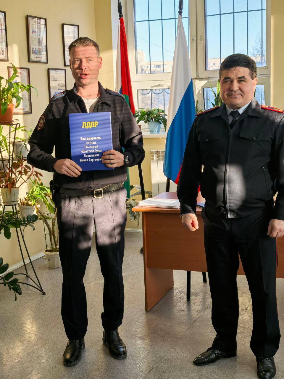 Координатор первичного отделения ЛДПР Тагир Саидов поздравил участковых уполномоченных полиции отдела № 7 города Тюмени, выразил слова благодарности за доблестную службу и вручил Благодарственные письма от депутата ЛДПР Ивана Вершинина