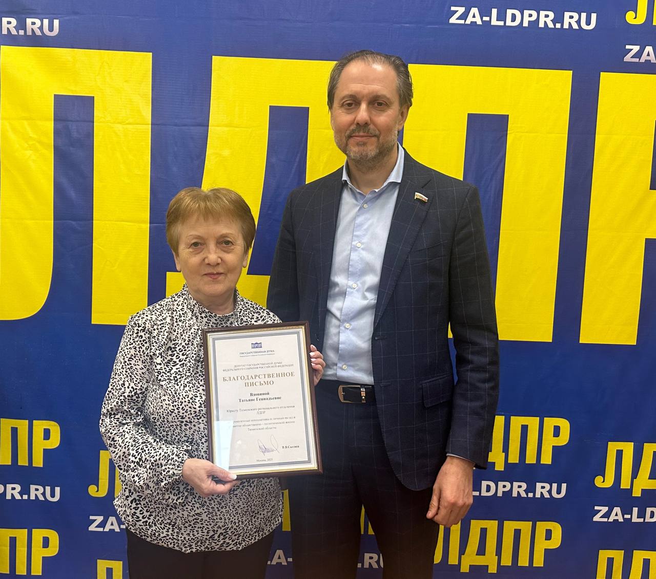 Владимир Сысоев вручил Благодарственное письмо юристу регионального отделения – Татьяне Вдовиной, поблагодарив за добросовестный труд и личный вклад в успешное проведение избирательной кампании 2025.